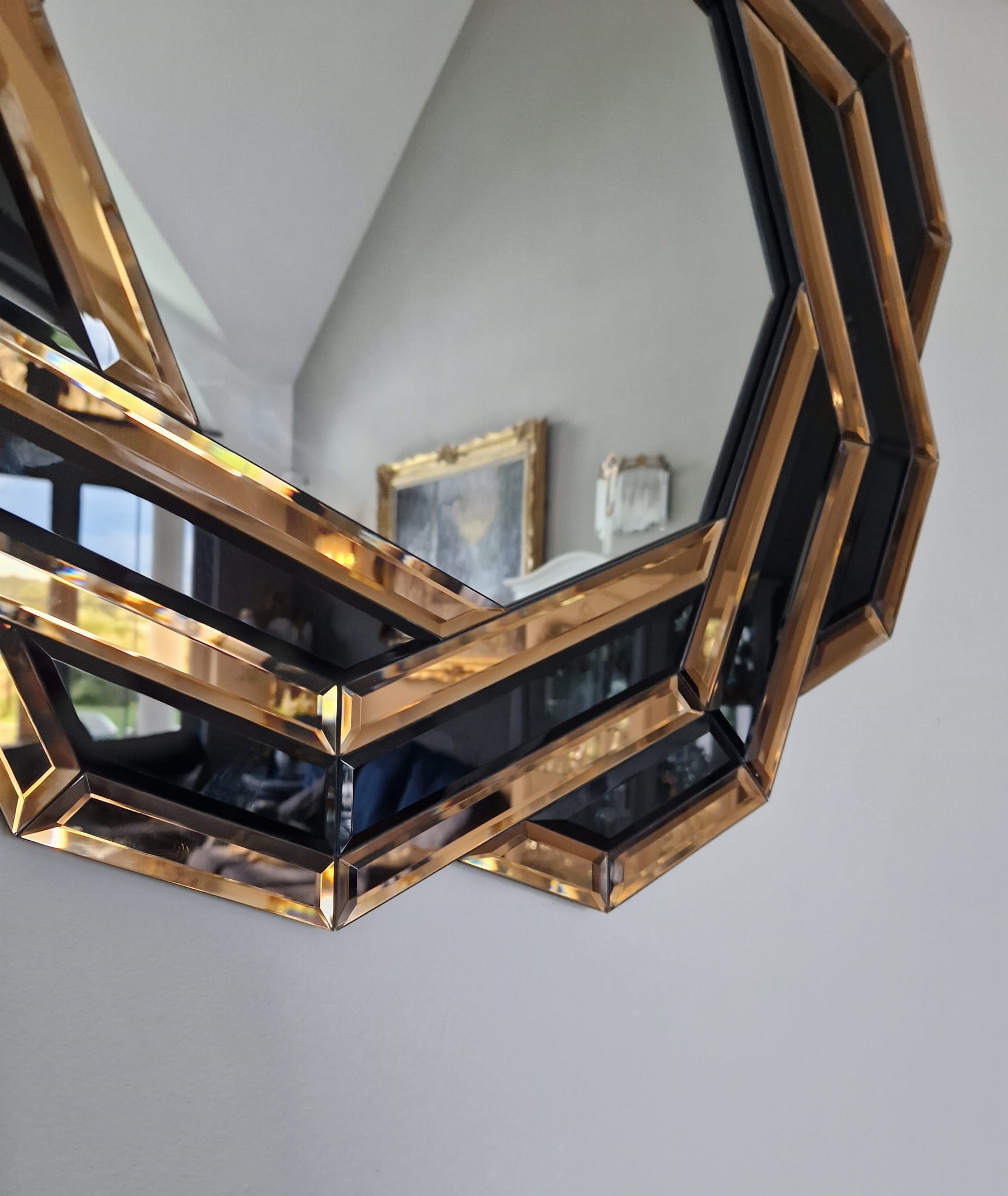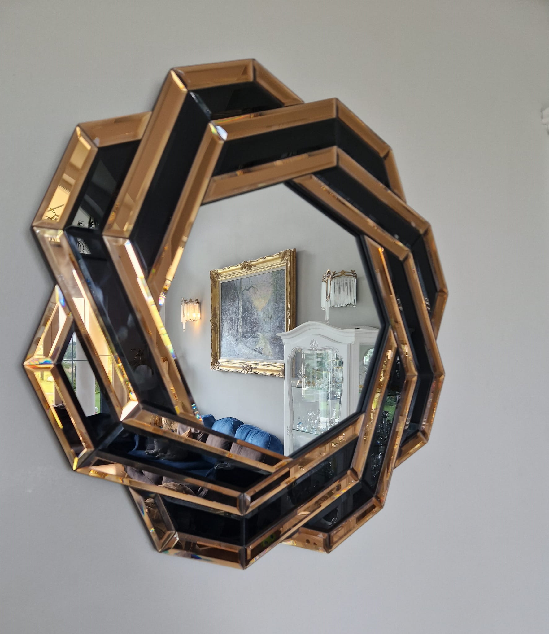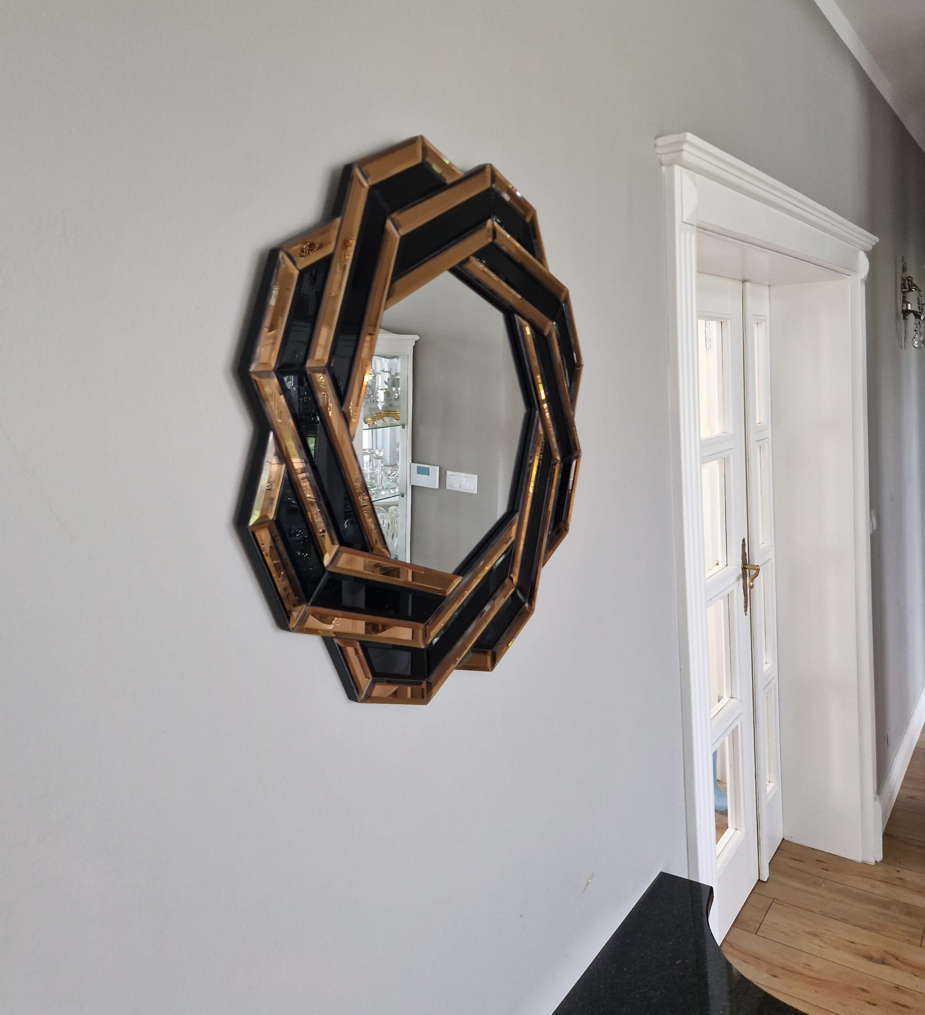 Lustro geometryczne glamour wprowadza do wnętrza aurę elegancji i harmonii. Doskonale współgra z meblami w stylu nowoczesnym, klasycznym lub art déco. Wspaniale wygląda nad komodą, toaletką lub konsolą, stanowiąc centralny punkt aranżacji. To propozycja dla osób, które cenią unikalny design, perfekcję wykonania i luksus w każdym detalu.