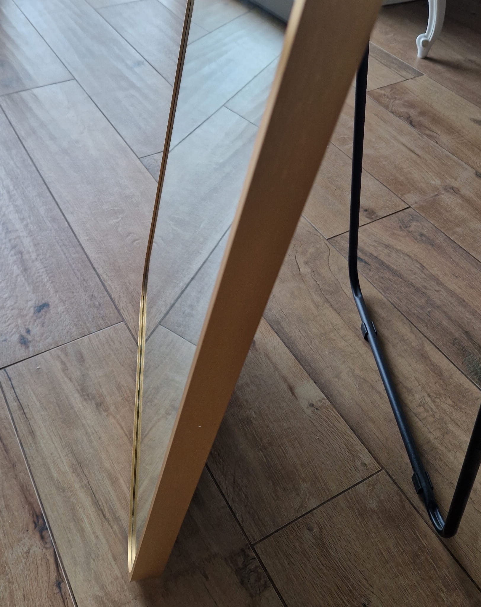 Lustro wyposażono w praktyczną składaną metalową nogę w kolorze czarnym. Mechanizm został zaprojektowany tak, by noga całkowicie chowała się wewnątrz ramy – umożliwia to zawieszenie lustra na ścianie bez żadnych odstępów. Z tyłu znajdują się dwie zlicowane metalowe zawieszki, które gwarantują stabilne i estetyczne mocowanie.